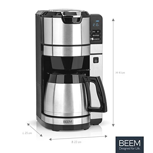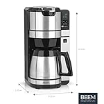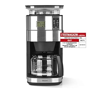Auf Knopfdruck oder zur Wunschzeit mahlt und brüht die BEEM FRESH-AROMA-PURE deinen Kaffee aus ganzen Bohnen! Das 1.100 W leistungsstarke Mahlwerk sorgt für den passenden Mahlgrad für Filterkaffee. Der integrierte 24-Stunden-Timer startet die BEEM FRESH-AROMA-PURE zum gewünschten Zeitpunkt und so lockt dich morgens der Duft von frisch gebrühtem Kaffee aus dem Bett. Dank der Isolierkanne dürfen auch gern einmal mehr Gäste zu Besuch kommen – für ausgedehnte Kaffeestunden. Zusätzliche Papierfilter sind aufgrund des Gold-Permanentfilters nicht mehr notwendig – der Umwelt zuliebe. Für die gründliche Reinigung auf Knopfdruck, mehr Hygine und ein unverfälschtes Aroma bietet dir die moderne Filterkaffeemaschine ein individuelles Reinigungsprogramm, welches Sie regelmäßig auf die Reinigung Ihrer Kaffeemaschine hinweist – Komfort pur! Für ganze Bohnen, aber auch bereits gemahlenem Kaffee. Kaffeebohnenfach für bis zu 80 g Bohnen. Technische Daten: max.1100 W, 220-240 V~ 50/60 Hz. Maße: 25,5 x 22,5 x 42,5 cm(L x B x H). Gewicht: 4 kg. Lieferumfang: Filterkaffeemaschine, Isolierkanne, Gold-Permanentfilter, Messlöffel.