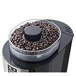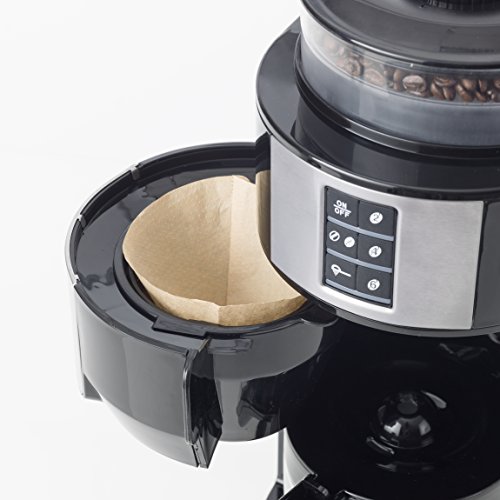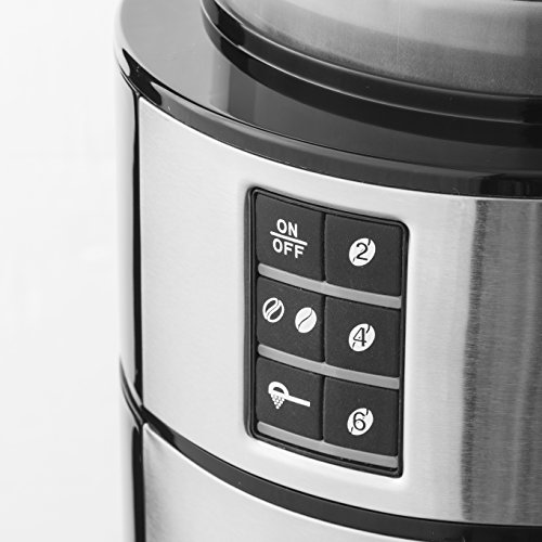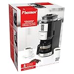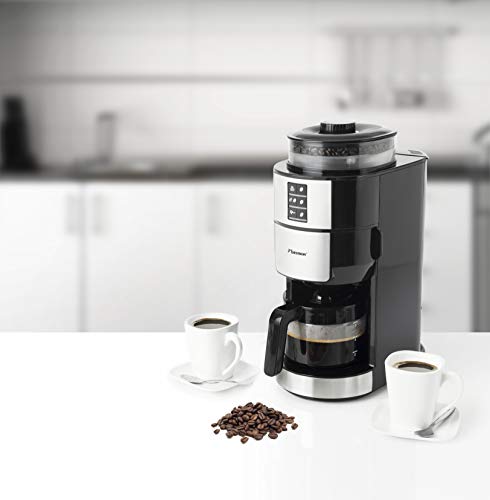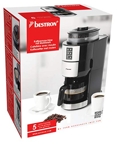 Elegante Kaffeemaschine mit Edelstahlfront und Edelstahl-Mahlwerk zum Genießen von frisch gemahlenem, aromatischen Bohnenkaffee – Übersichtliches Bedienfeld: 2 Kaffeestärken (normal/stark), 3 wählbare Mengen (2, 4 oder 6 Tassen), Wechsel von Bohnen- zu Filterkaffee (Typ: 101) – Wasserstandsanzeige innen (max. 750 ml), Großer Bohnenbehälter (max. 90 g), 5 Mahlgrade für individuellen Kaffee-Genuss, Praktische Warmhalteplatte – Einfache Reinigung: Herausnehmbarer Filterhalter mit Tropfverschluss und Kaffeekanne aus Glas, Platzsparend designt, Kabellänge: 85 cm – Lieferumfang: 1 Bestron Kaffeemaschine, Kanne, Leistung: 820 W, Kapazität: 750 ml Wasser/90 g Bohnen, Maße: 17x31x39 cm, Gewicht: 3,56 kg, Material: Kunststoff/Edelstahl, Farbe: Schwarz, ACM1100G