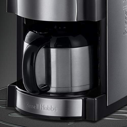 Fassungsvermögen: 10 Tassen 1,25 lThermo-Kaffeeautomat mit integriertem, konischen Kegelmahlwerkhochwertige Thermokannedigitales Bedienelement mit programmierbarem Timer (24 Stunden)Brühstärkeneinstellung und Uhrzeit, 9-stufige MahlgradeinstellungVorratsbehälter für Kaffeebohnen 250 geinstellbare Mahlmenge von 2 – 10 Tassen, mahlt die gewünschte Menge an Kaffeebohnen und transportiert den gemahlenen Kaffee in den Filterträgerbrüht auch bereits gemahlenen Kaffeeautomatische Abschaltung (2 Stunden nach dem letzten Brühvorgang)TropfstoppWasserstandsanzeige mit FüllmengenmarkierungOberfläche aus hochwertigem, gebürstetem Edelstahl mit KunststoffapplikationenGerätemaße Höhe x Breite x Tiefe: 350 x 267 x 210 mmGewicht: 2509 g,1000 Watt, Schukostecker CEE 7/7